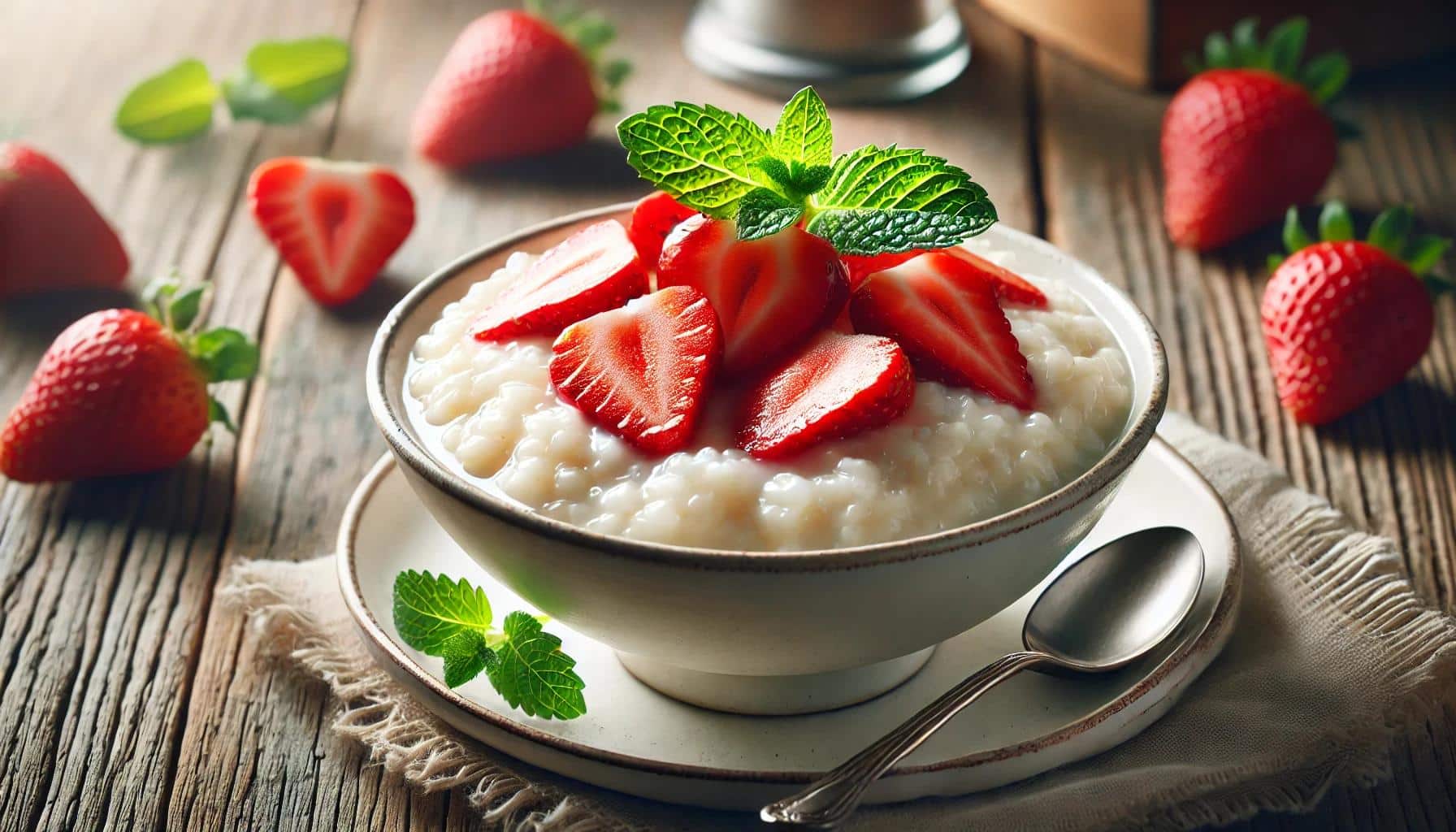Απολαύστε το ρυζόγαλο με φράουλες ως ένα δροσιστικό επιδόρπιο που συνδυάζει την παραδοσιακή γεύση με μια φρέσκια νότα!