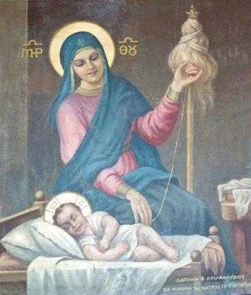 Πρόκειται για μια από τις σπανιότερες εικόνες της Παναγίας, όπου ως Μητέρα του Κυρίου, Τον κανακεύει σαν μωρό και γνέθει για να Του πλέξει ρουχαλάκια.