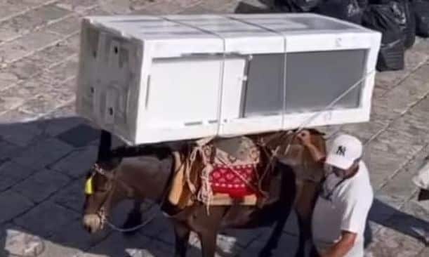 Άλλες εικόνες δείχνουν ένα ζώο να κουβαλάει βαριά ξύλα, ενώ ένας άλλος γάιδαρος φαίνεται να μεταφέρει ένα ψυγείο δεμένο στην πλάτη του.