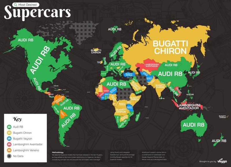 Το supercar που αναζητήθηκε περισσότερο σε 95 από τις συνολικά 169 χώρες του κόσμου είναι το R8 της Audi. Το οποίο τις πρώτες εβδομάδες του 2019 έφτασε σχεδόν τις 940.000 αναζητήσεις, έναντι λίγο περισσότερων των 700.000 της δεύτερη Bugatti Chiron. Στην τρίτη θέση βρέθηκε η Lamborghini Aventador, ακολουθούμενη από τις Bugatti Veyron, Lamborghini Huracan, Lamborghini Veneno, McLaren 675LT, Ford GT και Ferrari 458.