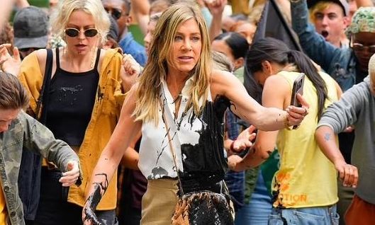 Μέσα σε όλο αυτό το χάος, ηθοποιοί στο παρασκήνιο που ενσαρκώνουν αστυνομικούς συρρέουν γύρω από το πλήθος για να ελέγξουν την εξέγερση. Αφού ο σκηνοθέτης φώναξε «cut», η Άνιστον άρχισε να αστειεύεται με το καστ και το συνεργείο.